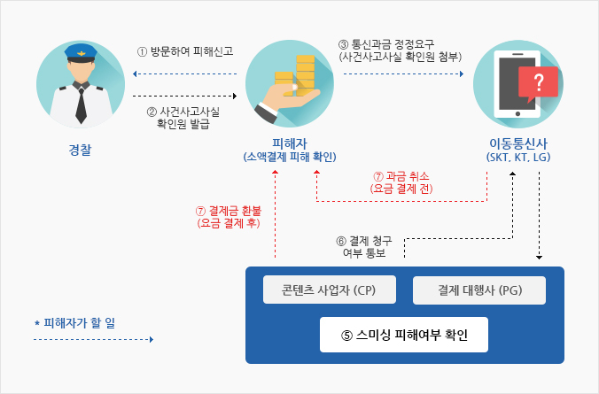 5.결제대행사와 콘텐츠사업자는 상호 협의하여 청구된 내용에 대해 스미싱 사기에 의한 피해인지 여부를 확인하게 되고