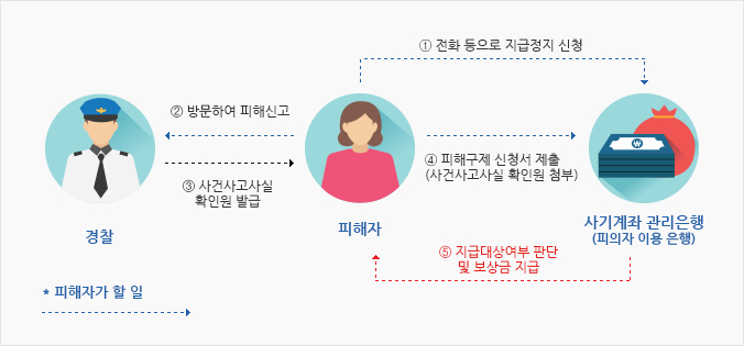 - 피해자는 범죄에 이용된 계좌를 관리하는 금융회사에 전화로 지급정지를 신청합니다. 전화로 하는 경우 3일 이내에 지급정지에 필요한 서류(사건사고사실확인원, 피해구제신청서)를 제출해야 합니다. 단, ‘지급정지 신청’이 필수절차는 아님