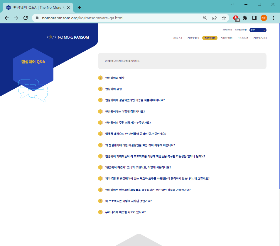 - '랜섬웨어 해결사' 코너가 무엇이고 어떻게 사용하나요?